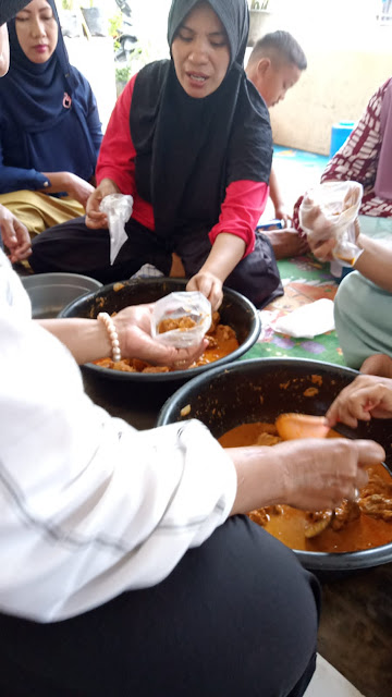 Kali ini, usai shalat Jum’at, ibu-ibu membagikan 260 nasi bungkus, ada rinciannya 150 nasi bungkus sambalado tambah sayur kering dari RT01 dan 80 nasi bungkus sambal ayam gulai tambah lalapan timun dari RT04 dan 30 nasi bungkus dari RT03. Dibagikan oleh ibu-ibu lintas RT ke jamaah usai shalat Jum'at.“, ungkap Bu Yusmarni Asra didampingi ibu-ibu RT01, RT03 dan RT04. Jum’at (15/07/2022).